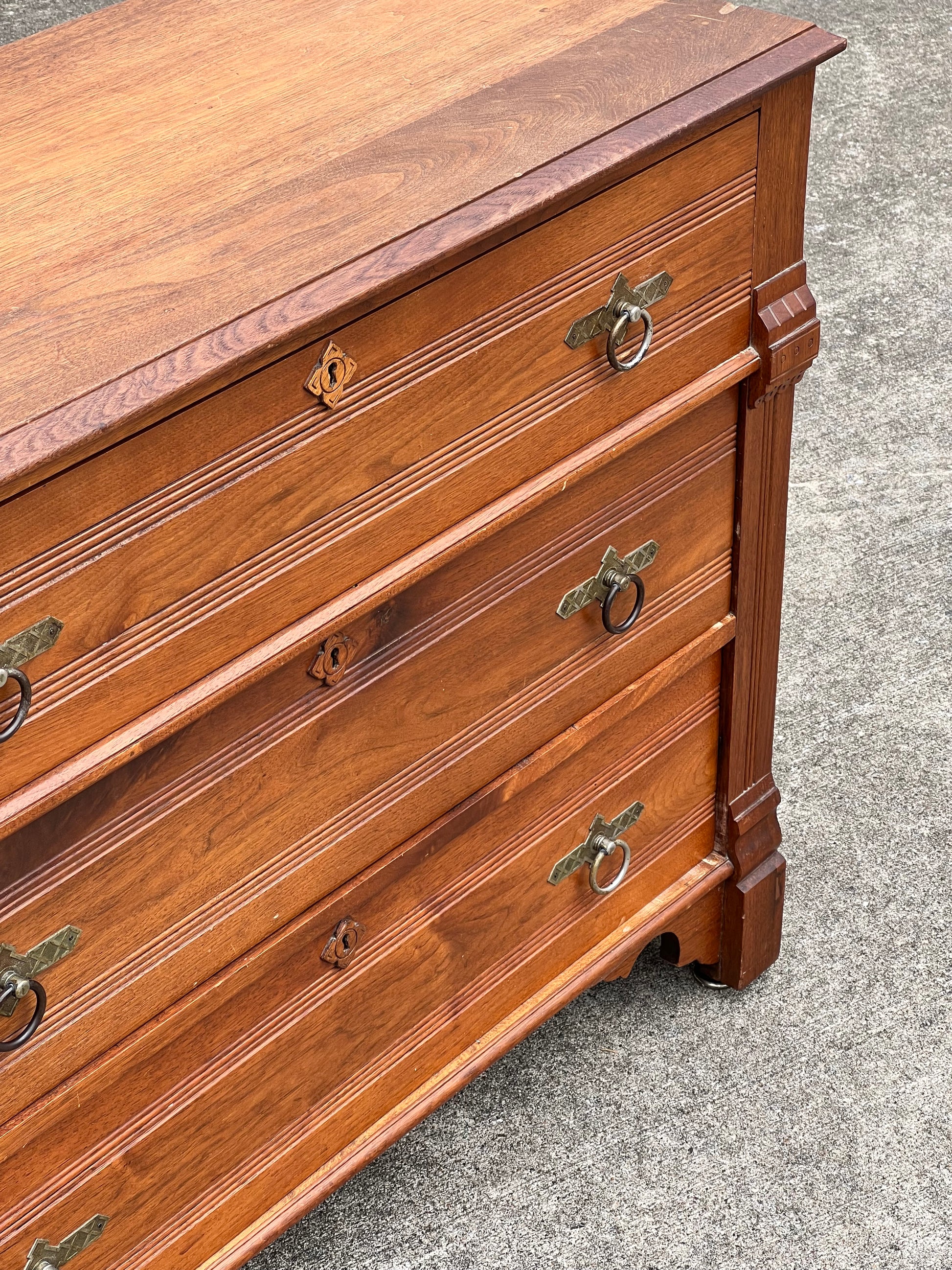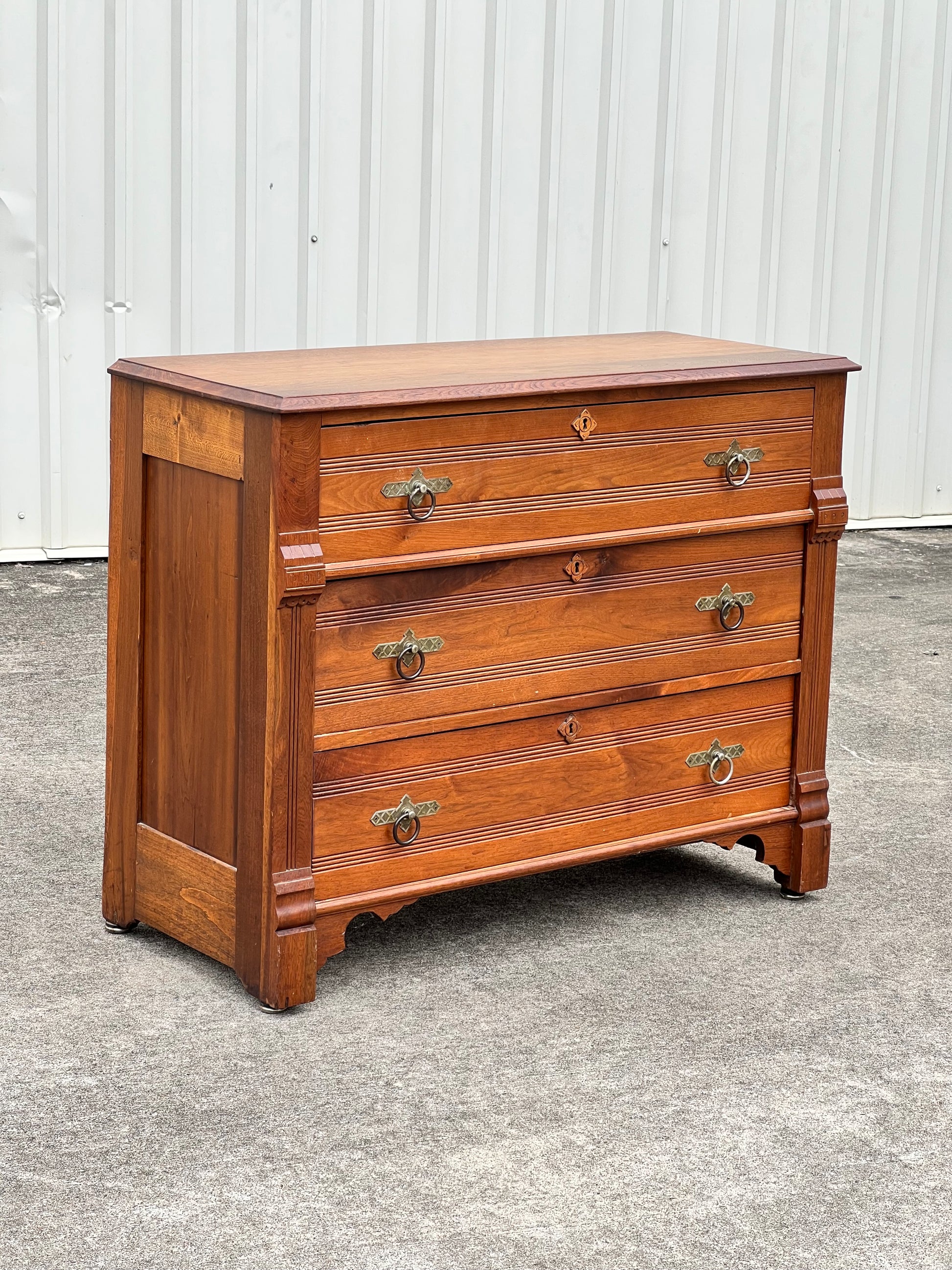 Antique 3 drawer chest, that can serve as a console table, a dresser or entryway piece in your home. Made of solid cherry wood that features hand carved inlay grooves on the drawers and pillars. This beautiful chest also has wooden crafted keyholes with intricate details. Reminiscent of the Eastlake style popular after the victorian era but also with influences of French empire designs. A gorgeous standalone piece ready to make a statement or simply for functional use.